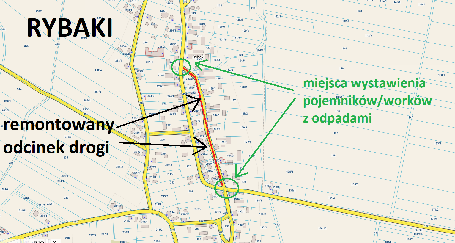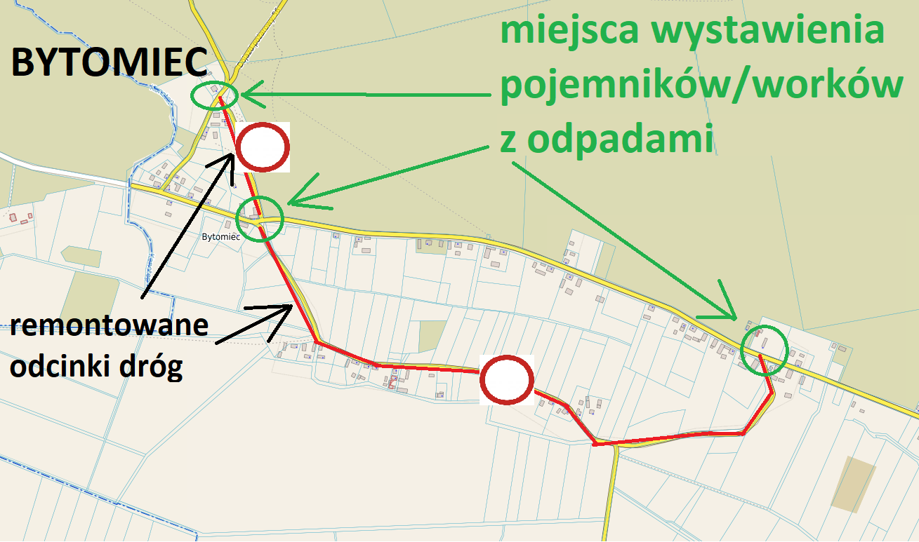 W związku z trwającymi pracami remontowymi nawierzchni dróg w m. Bytomiec i Rybaki (gm. Maszewo), Zarząd Związku informuje mieszkańców, że mogą nastąpić utrudnienia w odbiorze odpadów komunalnych. W związku z powyższym, mieszkańcy nieruchomości do których nie ma możliwości dojazdu, zobowiązani są do wystawienia odpadów do miejsc umożliwiających swobodny dojazd pojazdu odbierającego odpady komunalne. Prace remontowe będą postępowały, więc na dzień 18.09.2025 r. na załączonych poniżej mapkach podglądowych, zaznaczono sugerowane miejsca odbioru odpadów komunalnych. Informacja dotyczy szczególnie mieszkańców posesji o numerach:
