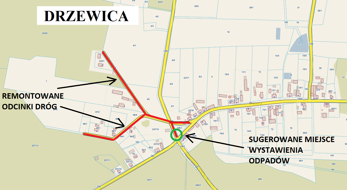 W związku z utrudnionym dojazdem po odpady do domków letniskowych (wzdłuż lasu), z powodu złego stanu nawierzchni drogi, uprzejmie prosimy mieszkańców o wystawianie odpadów w wyznaczonych miejscach przedstawionych na rysunku poniżej.